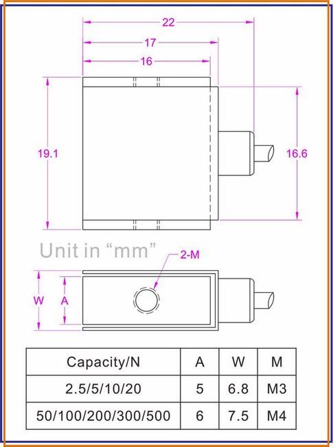 The standard lsb200 miniature s beam load cell model has female threads comes in 2024 aluminum construction 10 gram 10 lb or 17 4 stainless steel 25 lbs 100lbs and a 5 ft 29 awg 4 conductor.